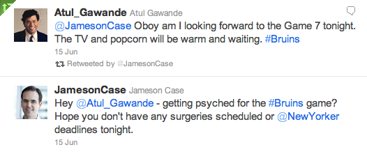 When the Boston Bruins (@NHLBruins) were neck deep in the Stanley Cup Playoffs in 2011, I noticed that Atul Gawande, M.D., (@Atul_Gawande) was chiming in on Twitter when the game was nerve-wrackingly close: