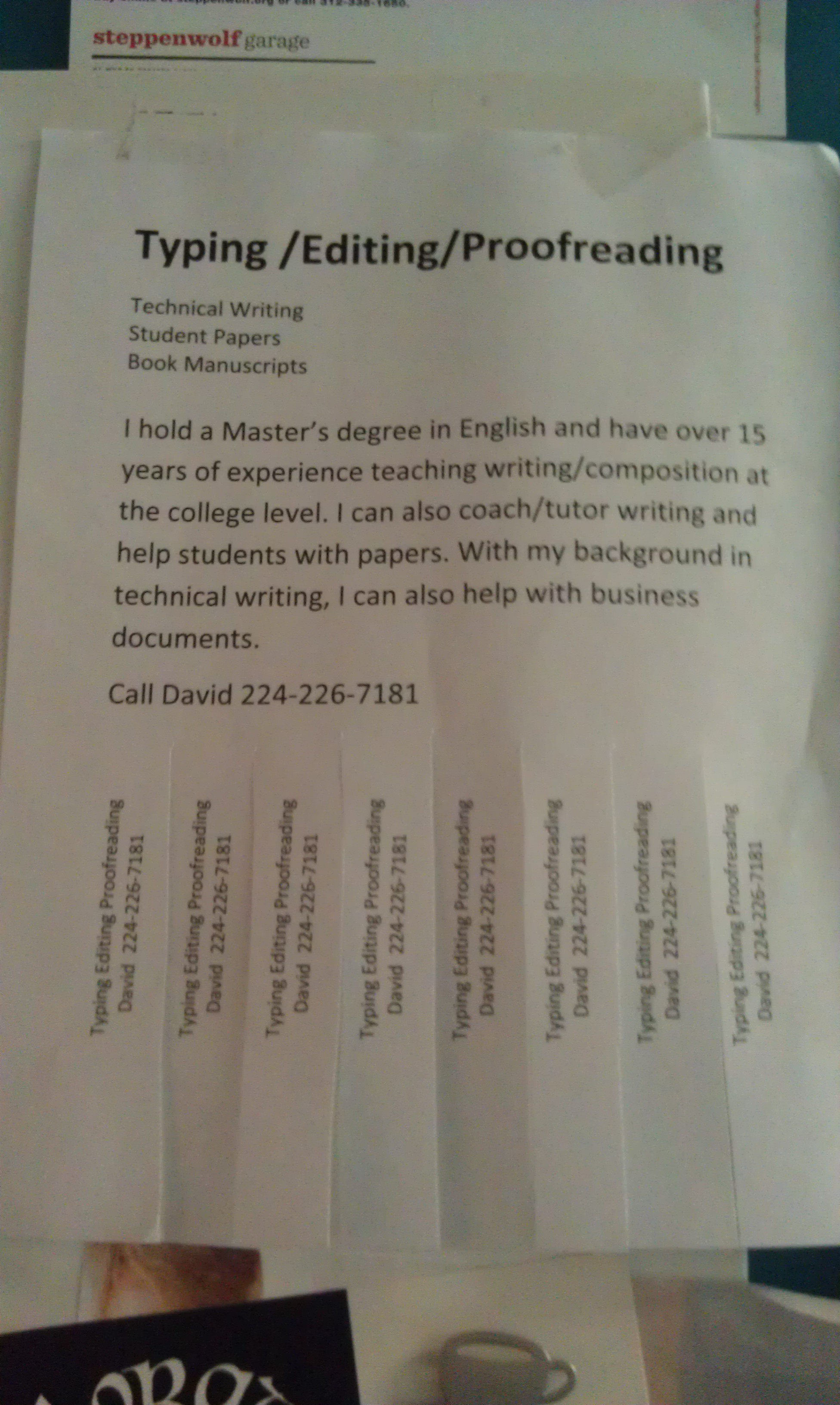 In the interest of helping out some Chicagoland writers and editors, I am passing on flyer information that I saw at a local coffee shop. Times are looking tight judging by the fact that no one has ripped the slips on these ads. Take a look and give them a call if you’re in the market!