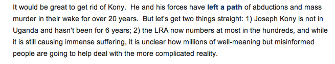 They did mention him immediately afterward in the next piece, an interview of a Ugandan journalist. The echo chamber was deafening. The journalist made the point that the the Kony 2012 film wasn’t for a Ugandan audience. It wasn’t for people who knew the score. She then brought out the two tropes getting so much traction as criticisms of Invisible Children’s message: that the civil war is over and that Kony isn’t in Uganda. These are fine points for a journalist to make (game over; losing team left), but showed no insight into what the group was actually trying to accomplish.