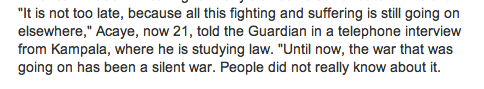 They did mention him immediately afterward in the next piece, an interview of a Ugandan journalist. The echo chamber was deafening. The journalist made the point that the the Kony 2012 film wasn’t for a Ugandan audience. It wasn’t for people who knew the score. She then brought out the two tropes getting so much traction as criticisms of Invisible Children’s message: that the civil war is over and that Kony isn’t in Uganda. These are fine points for a journalist to make (game over; losing team left), but showed no insight into what the group was actually trying to accomplish.