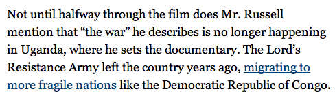 OK, but where does Russell set it up as a war to be stopped? It’s clear in the film that his goal is justice for what has occurred. Preventing attacks on civilians, conscription of children, and the sexual slavery of young women are acknowledged benefits of stopping Kony now, but the Times needs to point out that there is no war going on so why bother rubbernecking?